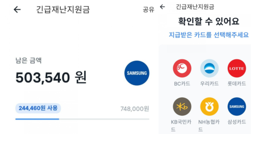그렇기 때문에 신용카드의 경우 본인이 쓰고 있는 신용카드 어플 혹은 사이트 안에서 확인이 가능합니다. 신청을 완료하고 지급까지 마친 상황이라면 이제 지원금을 사용하는 일만 남았는데요. 저도 지난 주에 신용카드로 신청을 해 10만원을 지원 받았습니다.